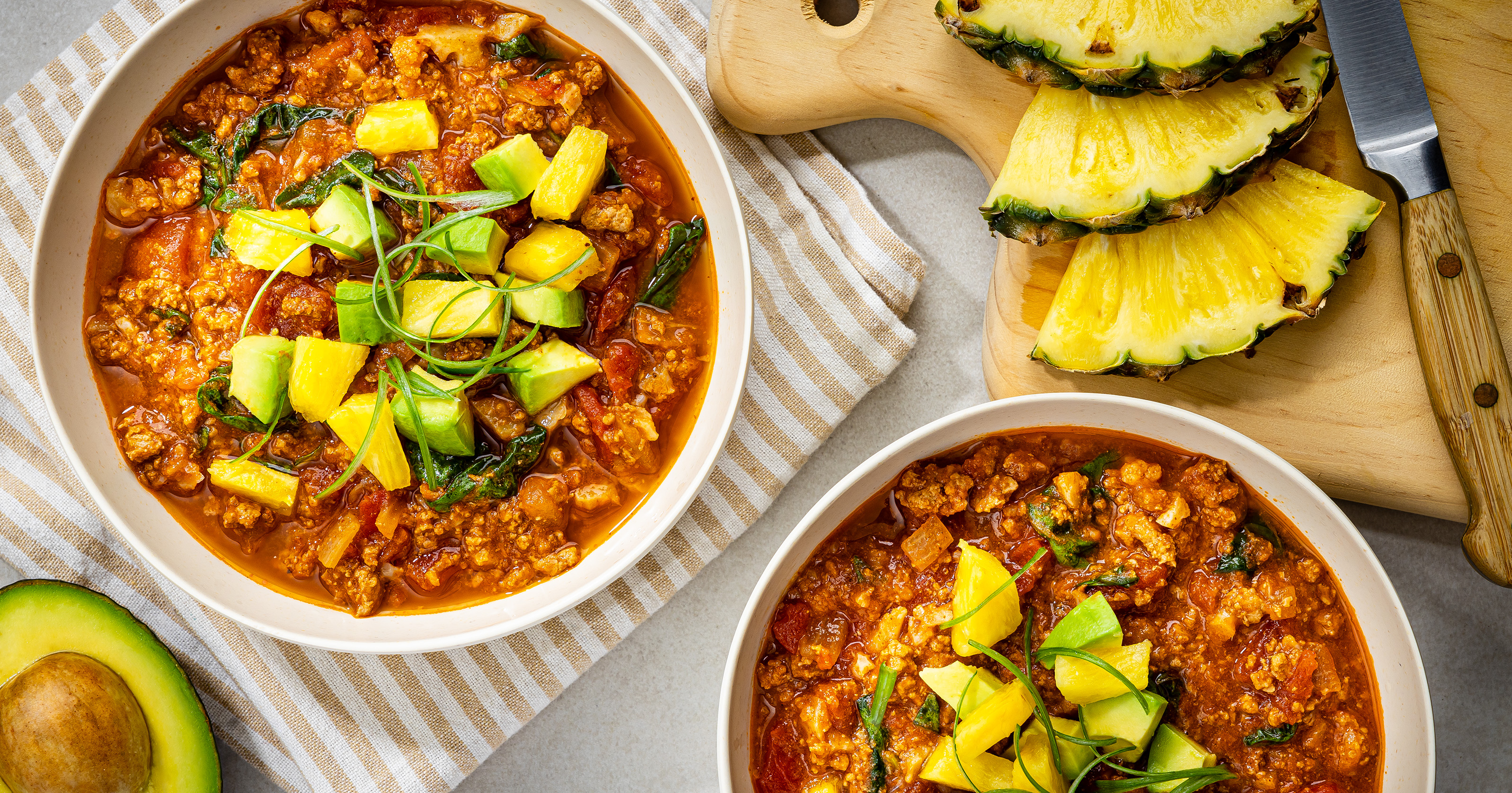 2. Serve chili garnished with pineapple, avocado and/or green onions, if desired.