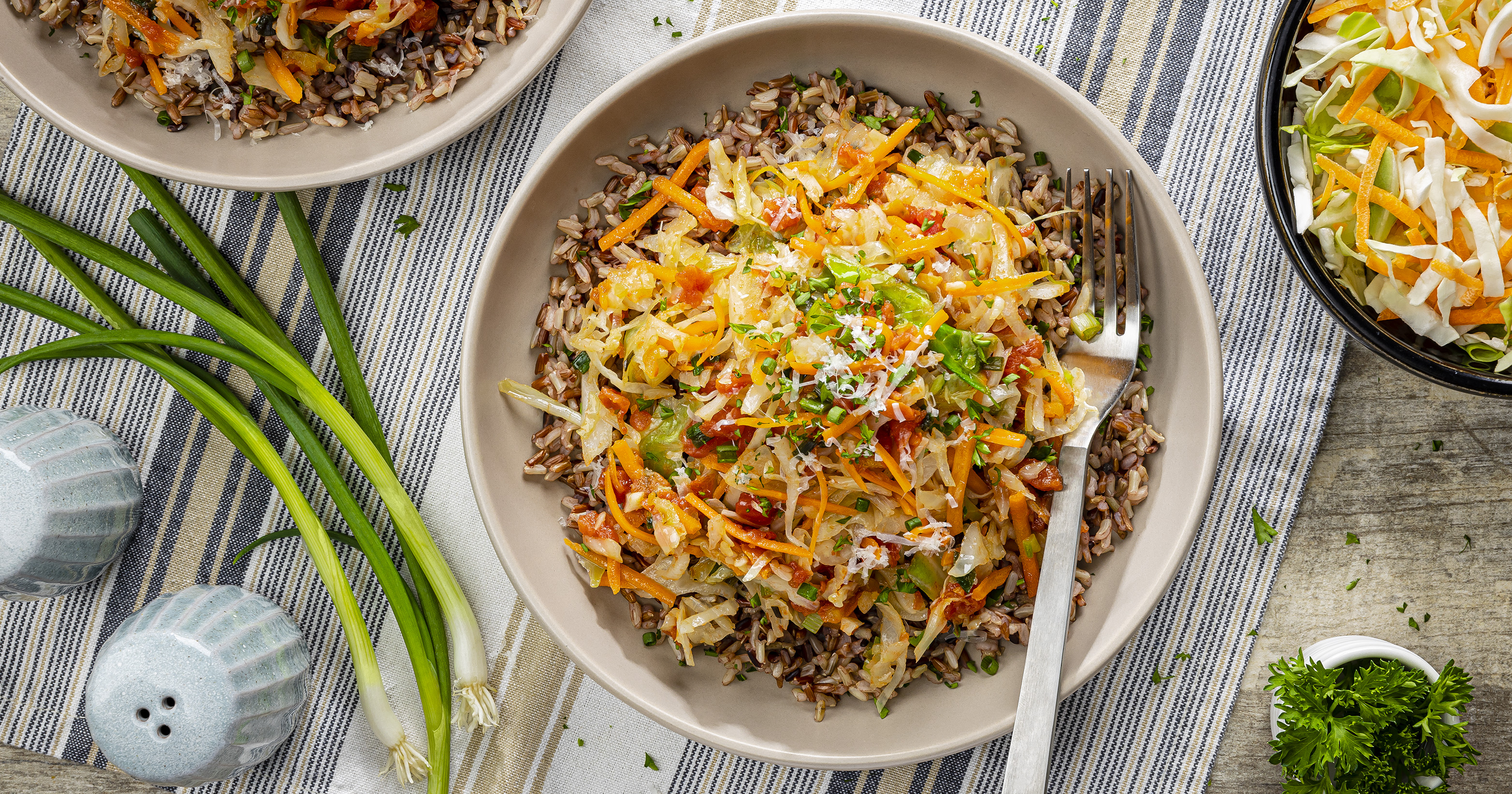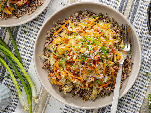 - Spoon hot rice into serving bowl, spoon coleslaw mixture over rice.