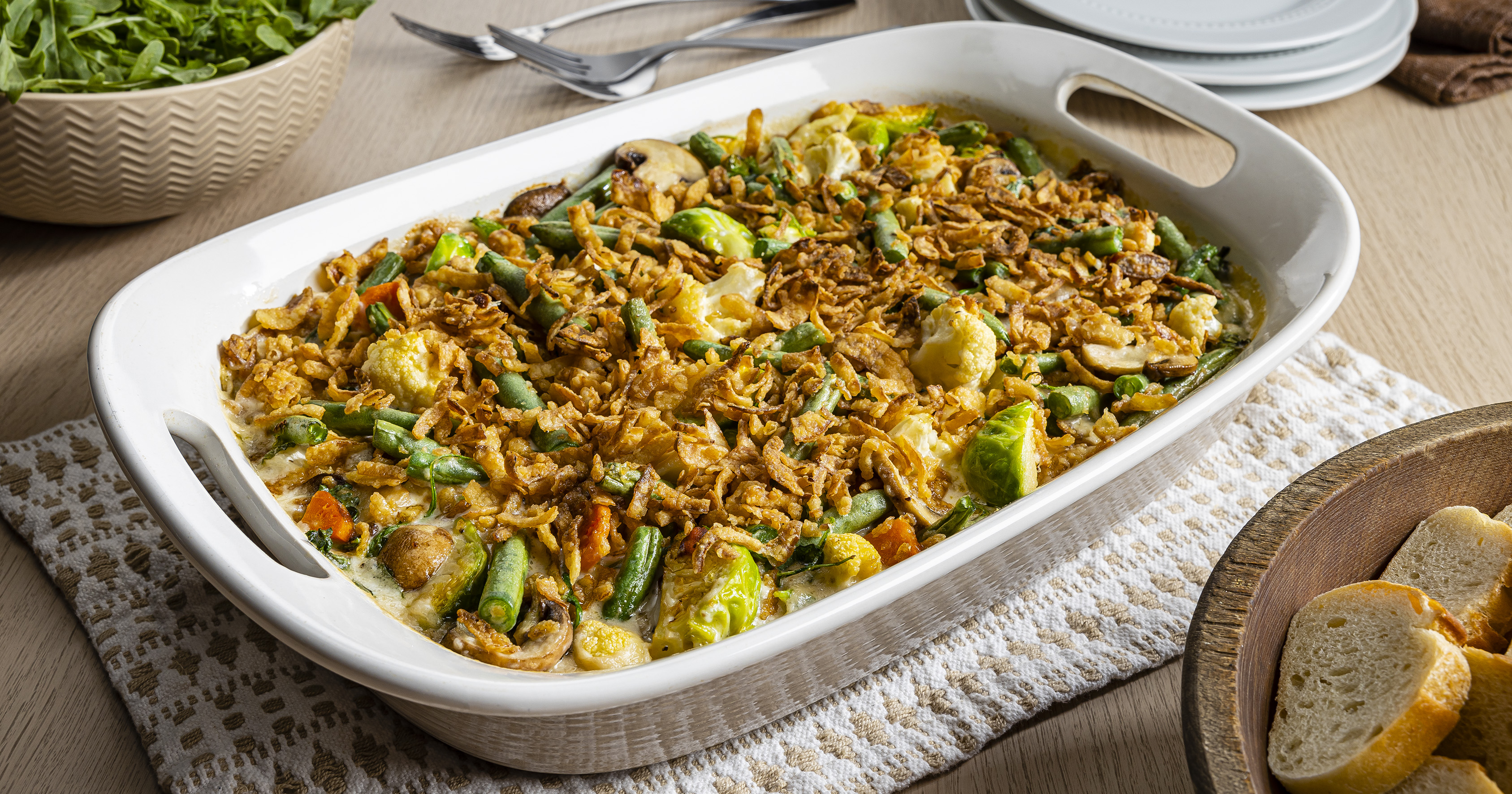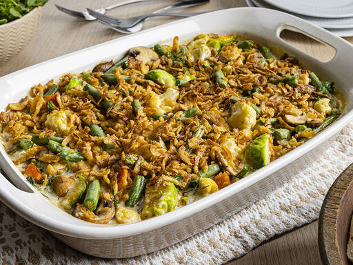 3. Spread vegetable mixture in prepared dish; sprinkle with crispy fried onions. Bake casserole 20 minutes or until heated through and top is golden brown. Makes about 10 cups.