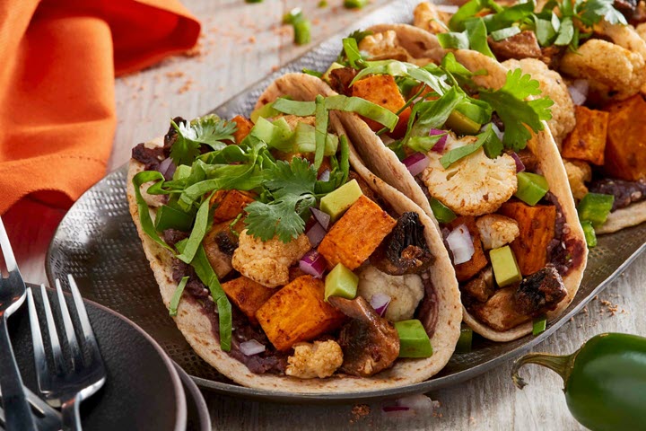 - Preheat oven to 400°F. Line a rimmed baking pan with parchment paper. Toss mushrooms, sweet potatoes, cauliflower, oil and taco seasoning in a medium bowl; spread in a single layer on prepared pan. Roast 35 minutes or until golden brown and tender. Makes about 4 cups.