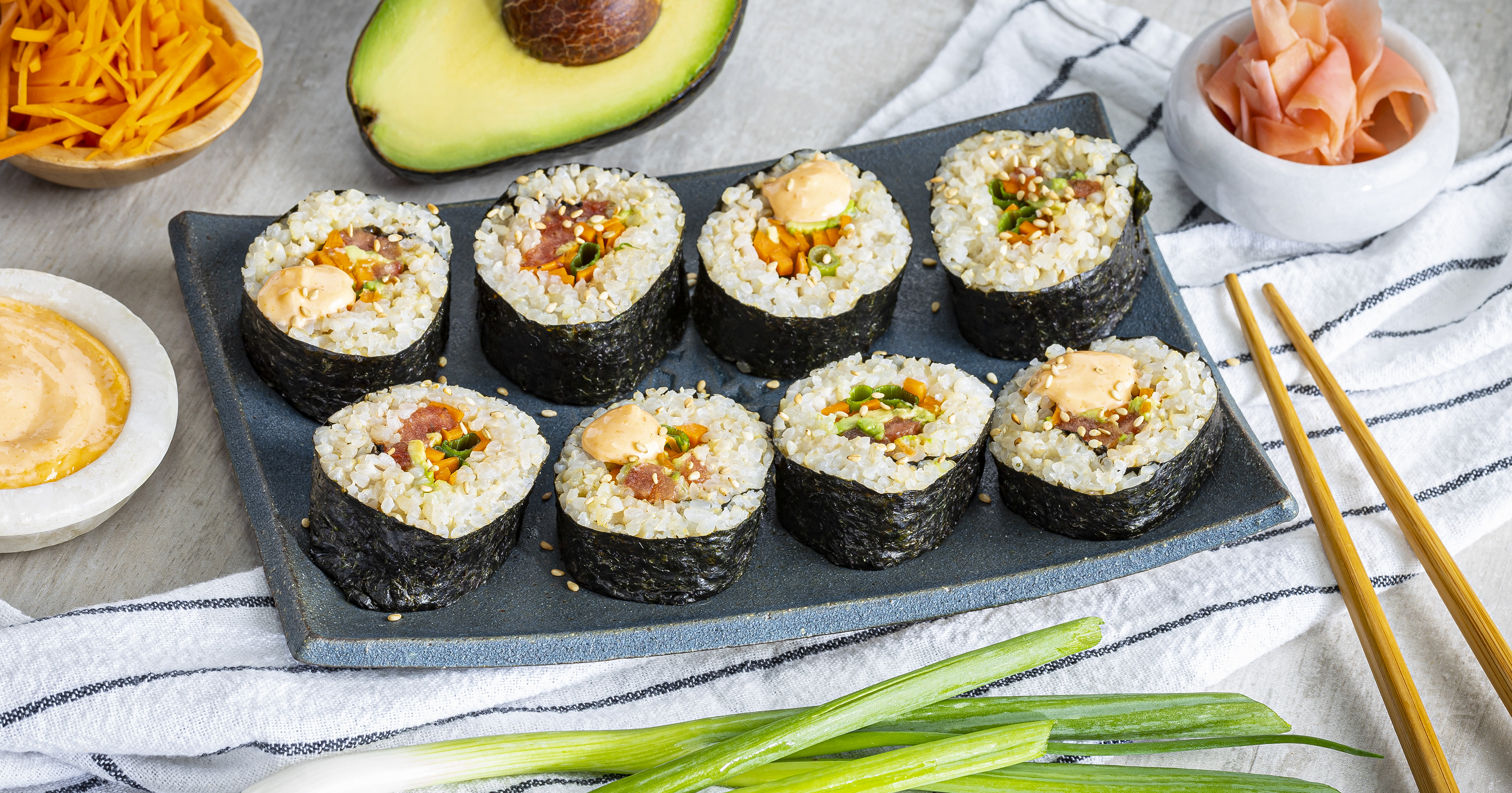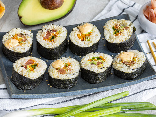- Wrap a bamboo sushi mat with plastic wrap; place mat lengthwise on work surface and place 1 nori sheet on top. Leaving 1-inch border along top edge, spread 1 cup rice over nori. Arrange about 5 pieces green onion, ¼ avocado, ¼ cup carrot and 6 slices tomato lengthwise down center of rice; drizzle with 1 tablespoon mayonnaise mixture. Starting from nearest edge, use mat to tightly roll nori around filling. Repeat with remaining nori, rice, filling and mayonnaise mixture. Makes 4 rolls.
