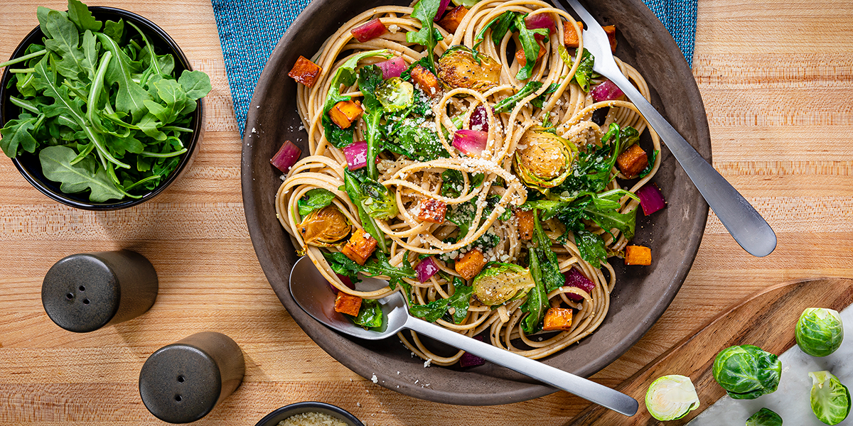 - Heat 1 tablespoon oil in a large skillet over medium heat; add potato and cook 10 minutes, stirring occasionally. Add onion and remaining ½ tablespoon oil; cook 5 minutes or until vegetables are tender, stirring occasionally. Add Brussels sprouts; cook 2 minutes or until lightly browned and tender. Add arugula; cook 1 minute or until wilted, stirring occasionally. Add vinegar, salt, pepper, 1 cup reserved pasta water and pasta; cook 2 minutes or until slightly thickened, stirring occasionally. Add remaining ½ cup reserved pasta water, if desired. Makes about 7 cups.