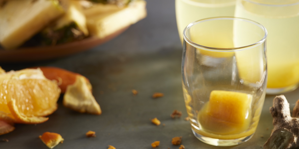 - Purée oranges and pineapple in food processor on high until liquefied; transfer to a medium saucepot. Stir in honey, ginger and turmeric; heat to a boil over medium-high heat. Reduce heat to medium, cover and simmer 5 minutes, stirring frequently. Strain through fine-mesh strainer into a pitcher, stirring gently to press out juice; discard pulp. Cool orange mixture to room temperature; stir in vinegar and pour into ice cube tray. Freeze at least 5 hours or until frozen. Makes 16 ice cubes.