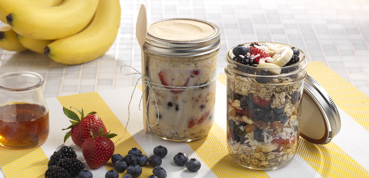 - Layer the oat mixture with berries, nuts, and coconut to fill pint-sized mason jars, pour almond milk over the top and seal with lids. Refrigerate overnight.