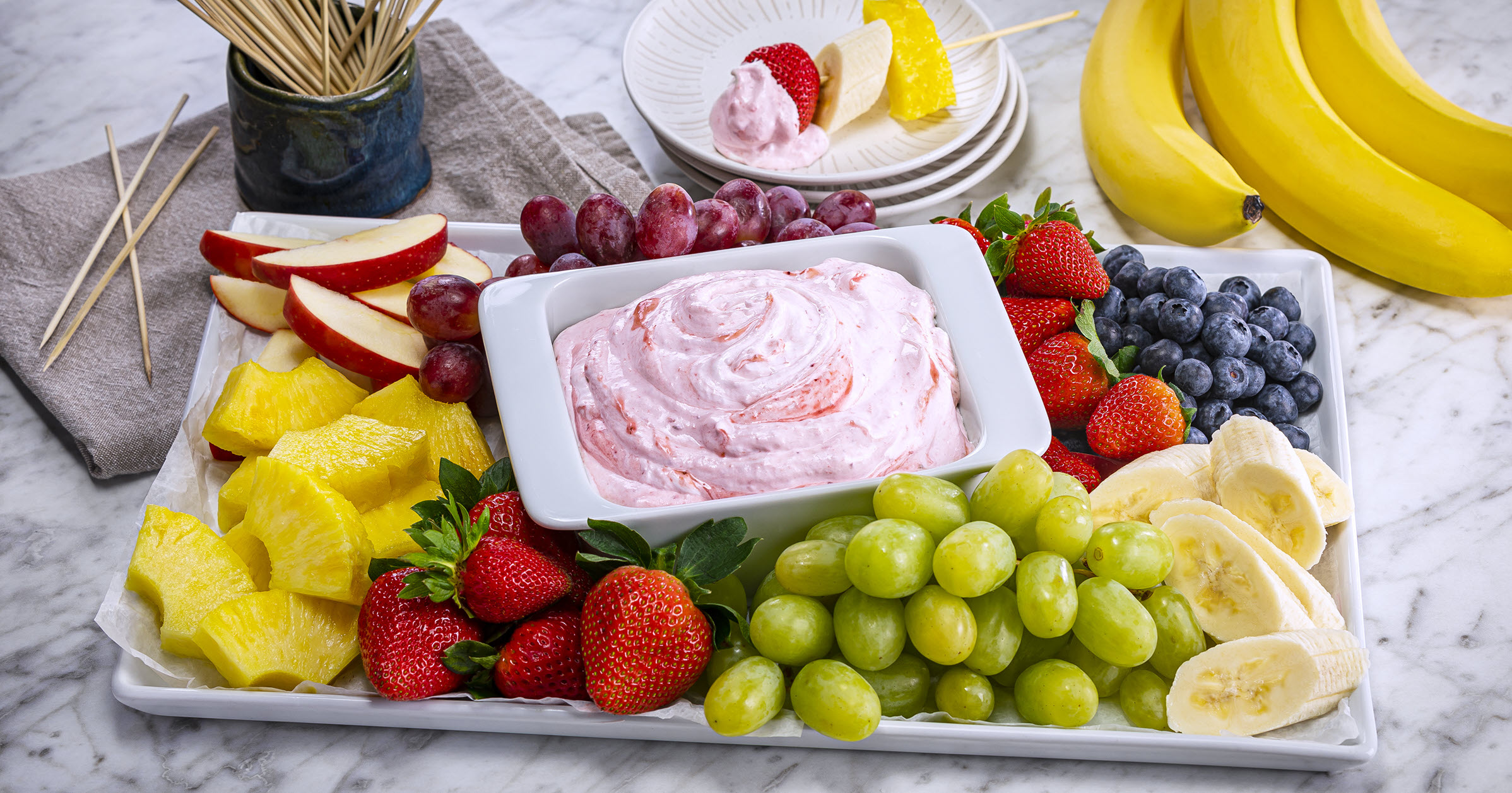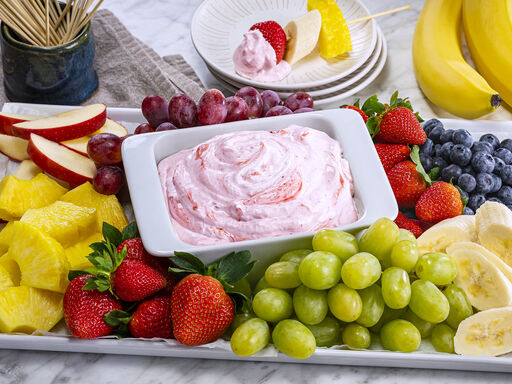 - Serve dip with grapes, apple, pineapple, blueberries and whole strawberries, if desired.