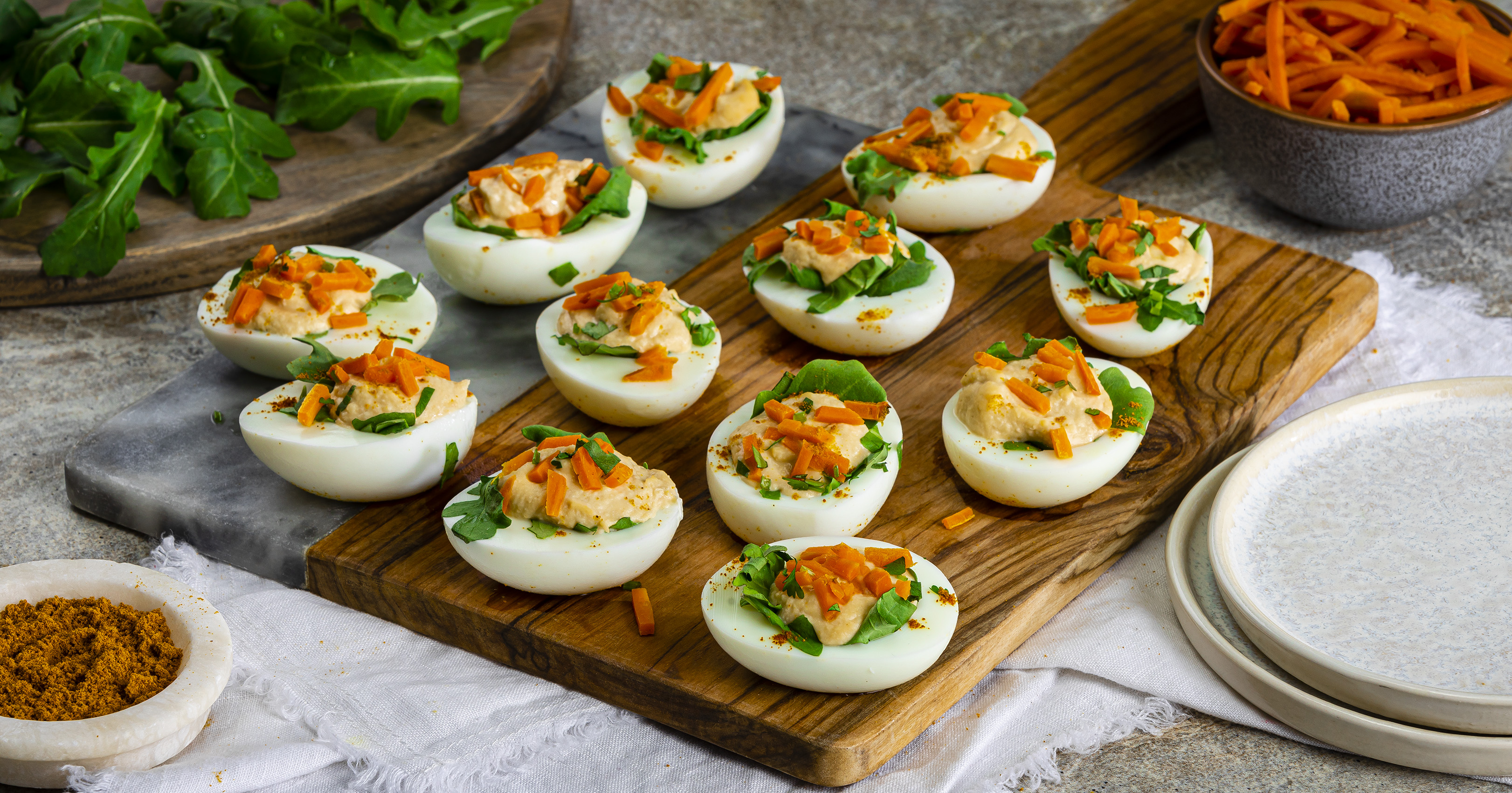 Fill egg whites' center with 3 or 4 arugula leaves. Top with heaping spoonful hummus, sprinkle with shredded carrots and cilantro. Enjoy immediately or refrigerate until ready to serve.