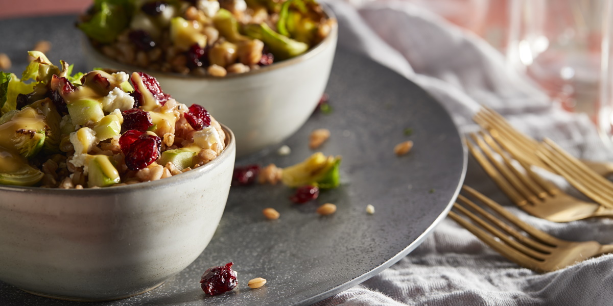 - Toss apple, cranberries, vinaigrette, and remaining ½ teaspoon salt and ¼ teaspoon pepper in a large bowl; fold in Brussels sprouts and farro. Serve warm sprinkled with cheese, if desired, or cover and refrigerate 1 hour or until chilled. Makes about 5 cups.