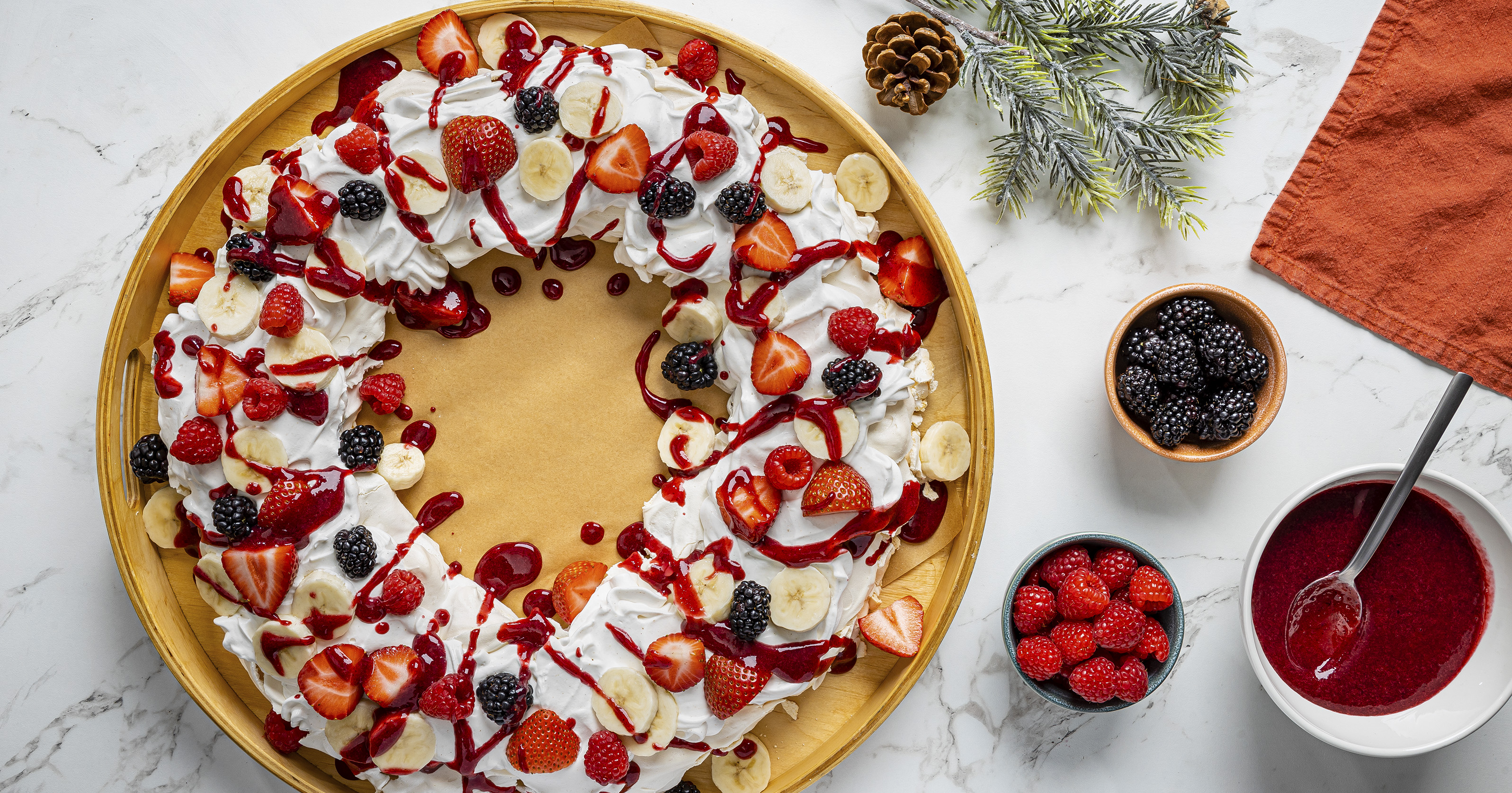 6. Remove the meringue wreath from parchment paper using a thin knife or metal spatula; place on a serving plate, if desired. Spread coconut whipped topping on top of meringue. Arrange banana slices, blackberries, and remaining strawberries and raspberries on top of the wreath. Serve with berry sauce.