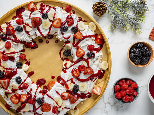 3. Shape the wreath: Using a large spoon, scoop a dollop of meringue, and drop it between the 2 circles. Repeat, adding dollops until the circle is filled in. Use remaining meringue to create a second ring by dropping dollops on top of the first layer. With a small offset spatula or the back of a spoon, flatten the top layer of the meringue, to create a flat base for the berries.