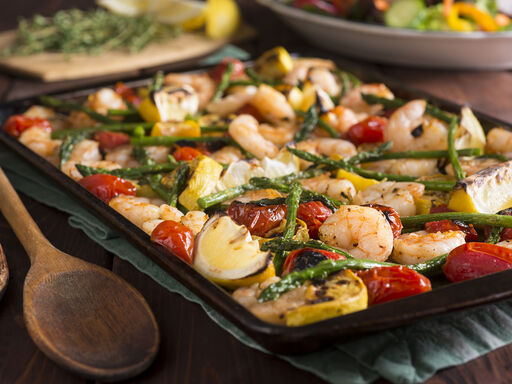 Try with shrimp or cod! Preheat oven to 450 F. Line sheet pan with aluminum foil. In large bowl season veggies with ½ the seasoning packet and spray with olive oil. Turn oven down to 425 F and bake veggies for 15 min. Meanwhile, add 1 pound large, peeled and deveined shrimp or 4, 5oz cod fillets to veggie bowl. Combine with remaining seasoning packet, toss to coat! Make room on veggie tray for shrimp. For cod, place fish in each of the 4 corners of the tray. Spray with olive oil and cook for 12-15 minutes until fish reaches an internal temperature of 145 degrees.