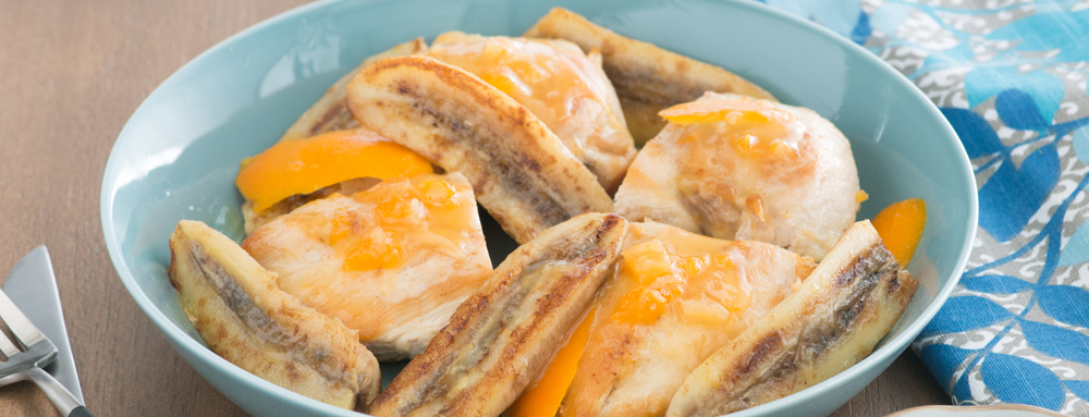- Mix cornstarch and remaining 1/4 cup water; stir into pan juices. Cook until sauce boils and thickens. Top chicken with bananas. Generously spoon sauce over all.