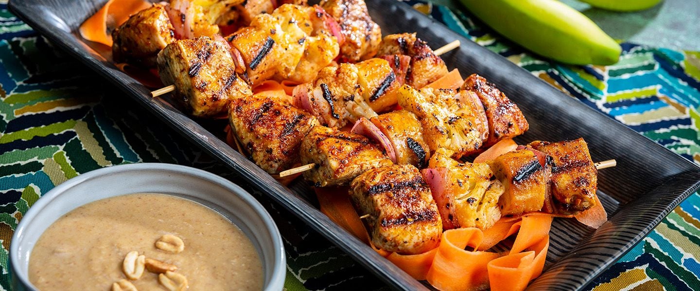 - Alternately thread chicken, bananas, onion and cauliflower onto skewers. Place skewers on hot grill rack; cover and cook 12 minutes, turning occasionally. Turn off burners on 1 side of grill; transfer skewers to unlit side of grill. Cover and cook 8 minutes or until internal temperature of chicken reaches 165°F and vegetables are tender, turning once.
