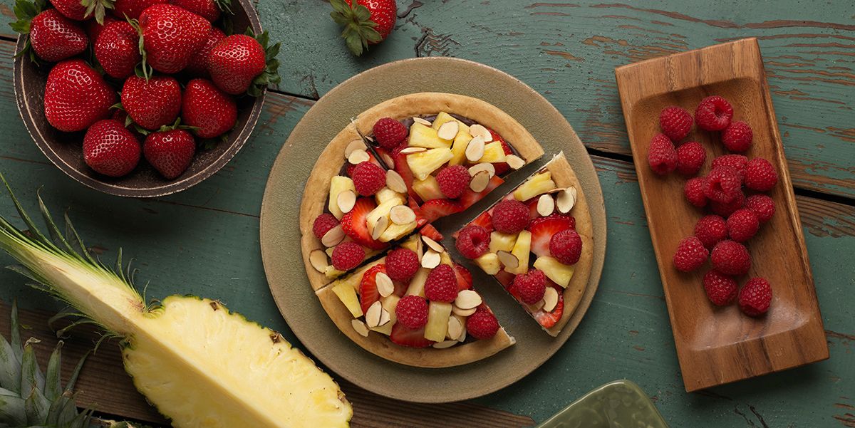 - Sprinkle almonds over fruit if desired, cut the pizza into four equal portions and serve while chocolate is still warm.