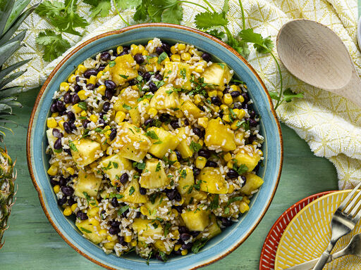 - Combine pineapple chunks, beans, corn and rice in large bowl.