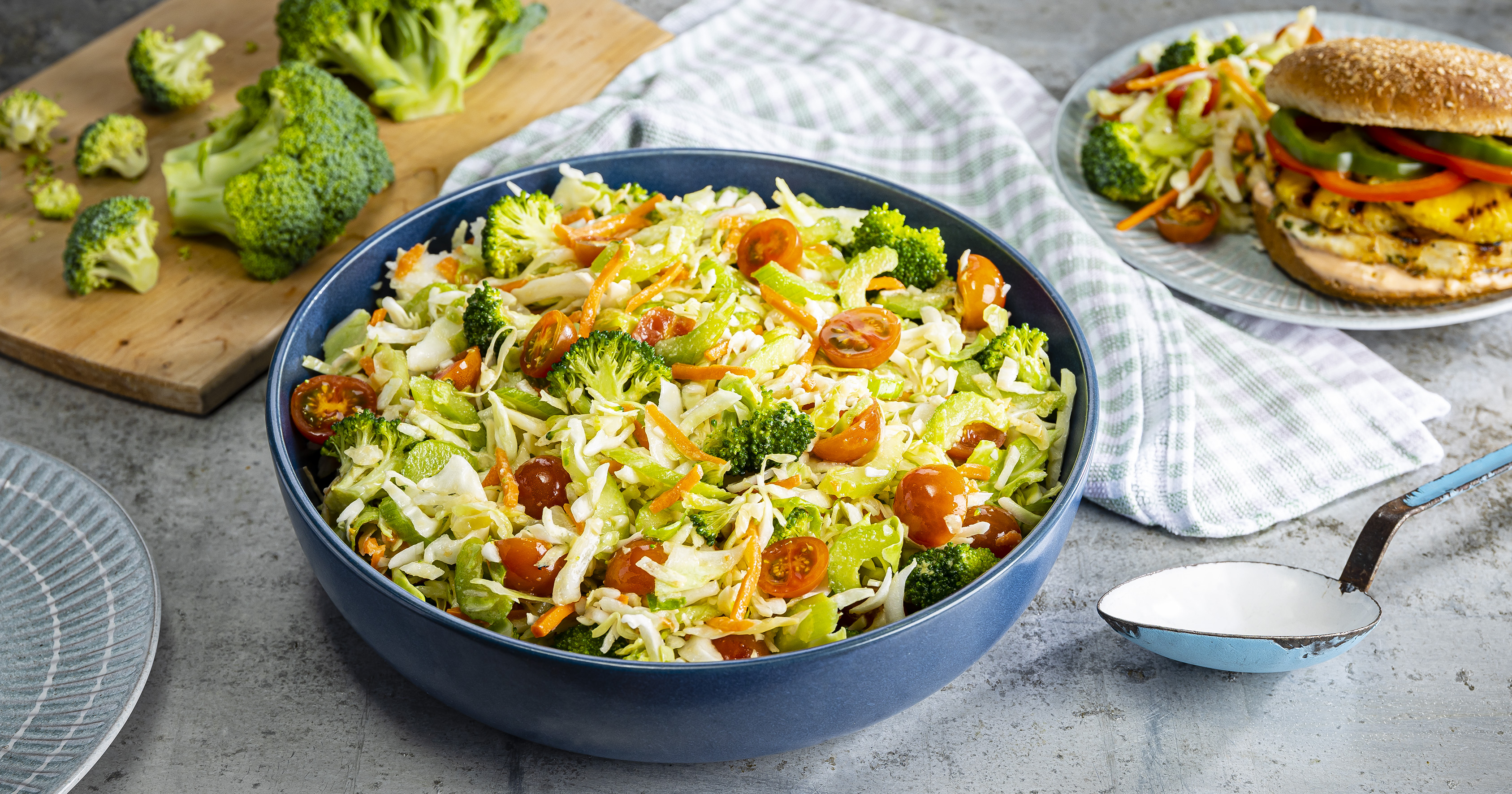 - Combine coleslaw, broccoli, celery and tomatoes, in large serving bowl.