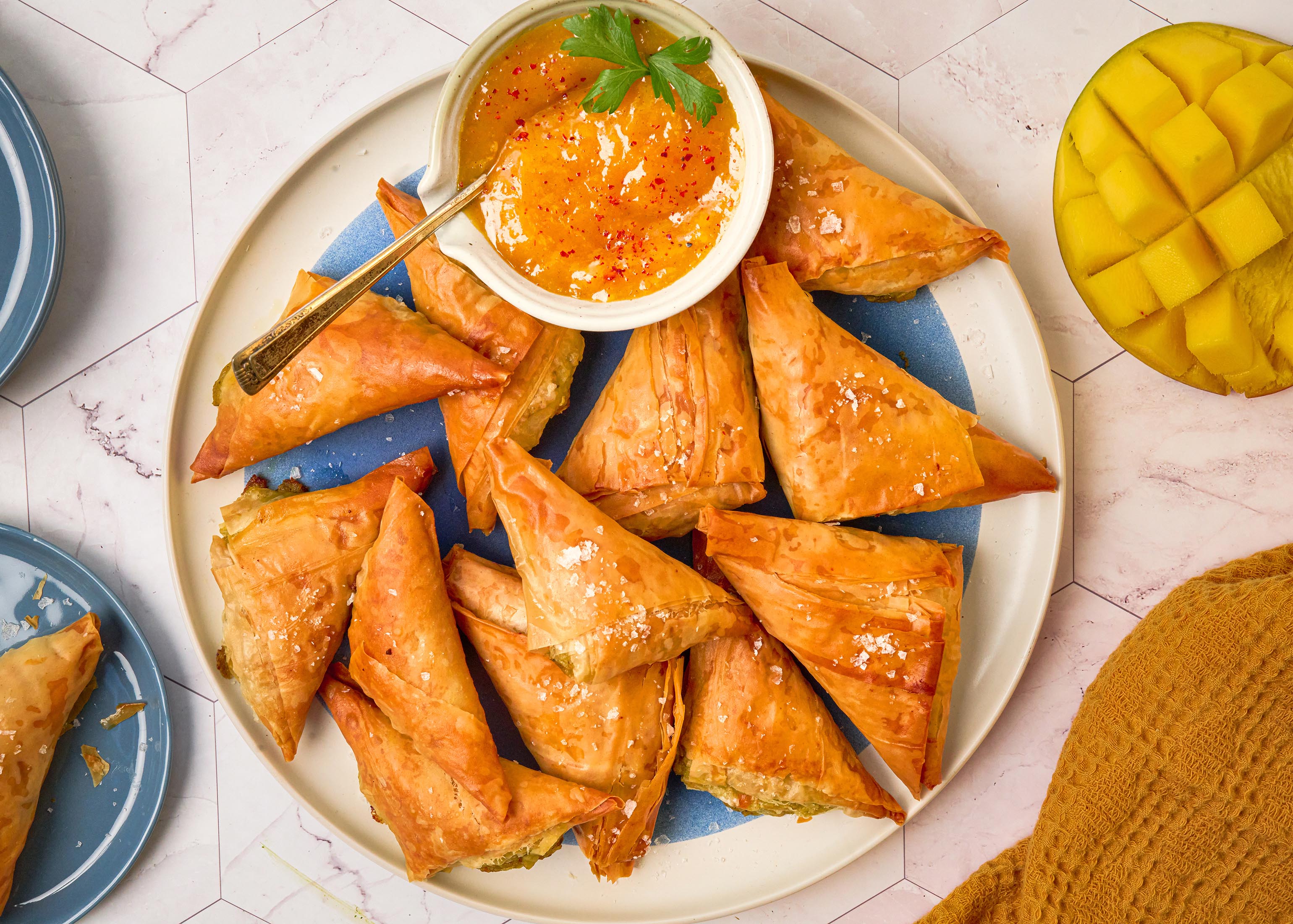 Preheat the oven to 375°F (190°C). Line a baking sheet with parchment paper. Layer two sheets of phyllo dough, one directly on top of the other, on a clean surface and lightly brush all over with olive oil. Cut the layered sheets into thirds lengthwise, so you have three long strips. Spoon a heaping 1 tablespoon of filling onto the bottom corner of one strip. Fold the corner over the filling to form a triangle. Continue folding, maintaining the triangle shape, until you reach the end of the strip. Brush the outside with more olive oil and place on the baking sheet. Do the same with the other two strips of phyllo.