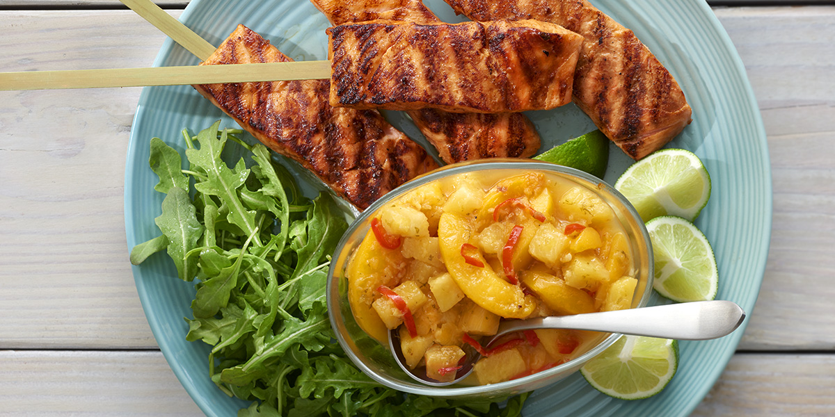 - Toss arugula with olive oil and balsamic vinegar, set aside. Arrange arugula, pineapple and salmon on 4 serving plates and add a spoonful of warm Pineapple Ginger Peach Chutney on top of the salmon.'
