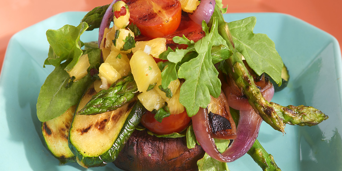 - Alternate grilled vegetables with arugula on four serving plates. Top with Pineapple Chimichurri (recipe below).