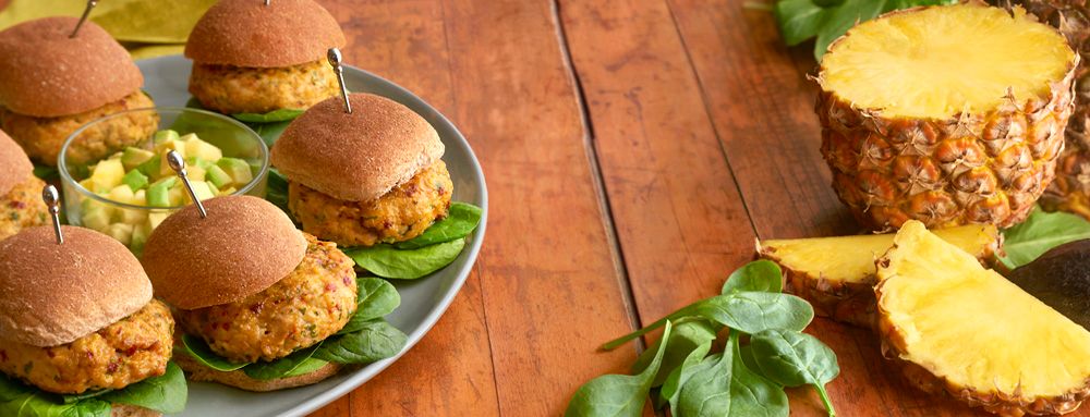- Arrange baby spinach equally among the slider buns. Place burgers on top and serve with reserved pineapple avocado mixture.