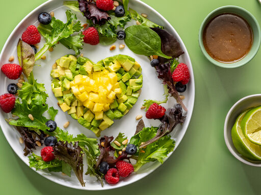3. Toss spring mix, vinaigrette and pine nuts in a medium bowl; arrange over pineapple. Scatter blueberries and/or raspberries around salad. Makes 1 salad.