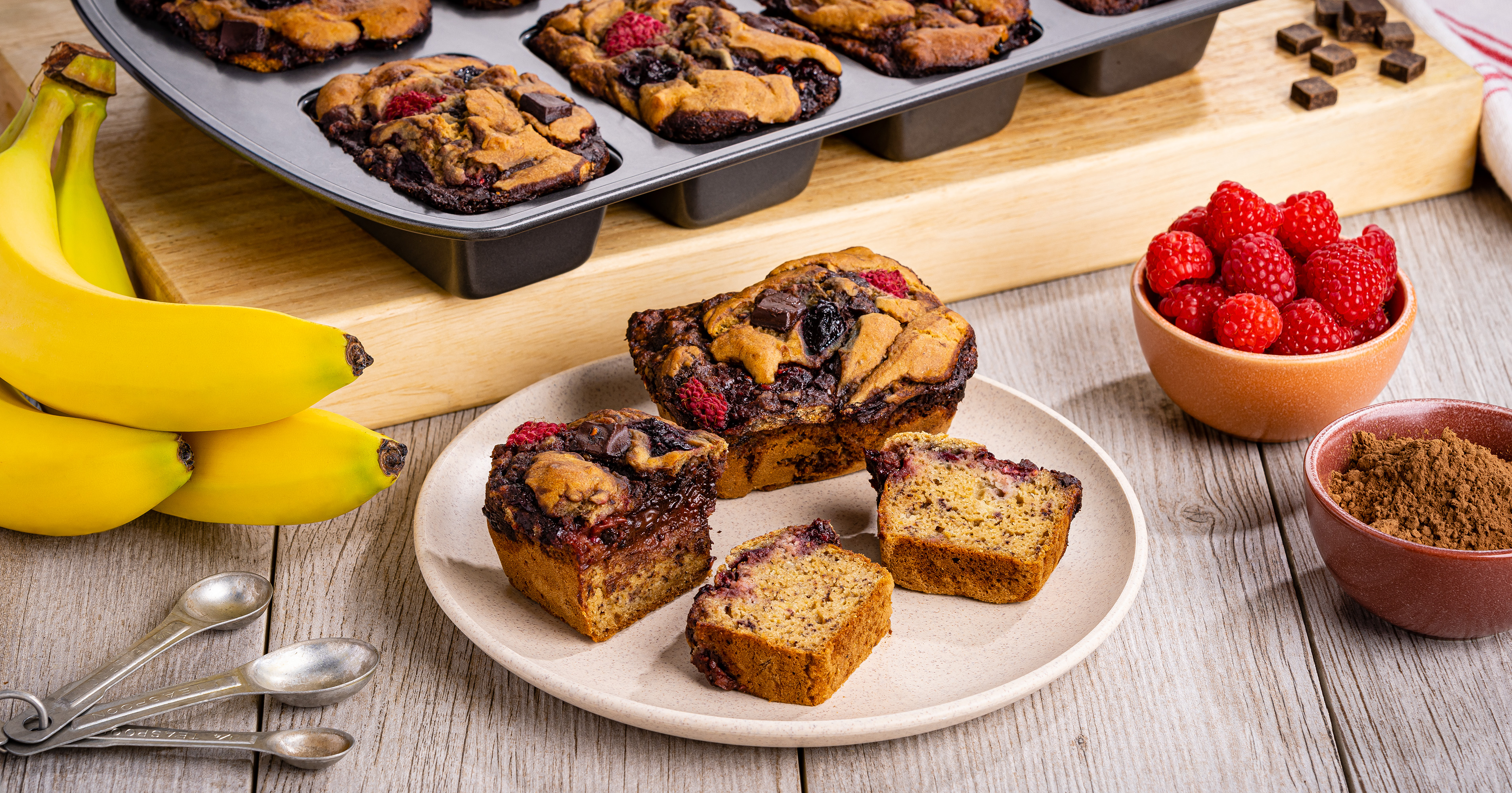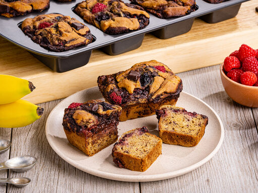4. Drop ¼ cup raspberry mixture on top of each loaf; gently swirl into batter with a butter knife. Top loaves with remaining ½ cup raspberries. Bake 25 minutes or until toothpick inserted in center comes out with a few crumbs and top is golden brown.