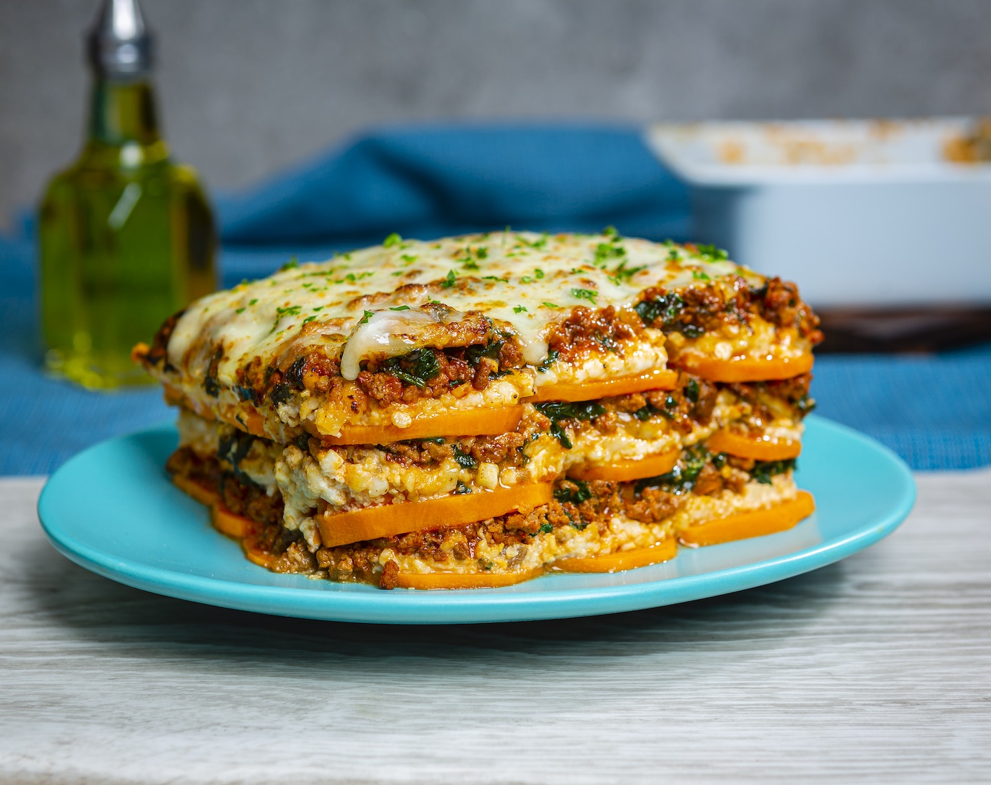 - Shingle ⅓ of the sweet potato slices in bottom of prepared dish; top with 1 cup of the cottage cheese mixture followed by 1½ cups of the turkey mixture. Repeat layers twice; sprinkle with mozzarella cheese and cover tightly with foil. Bake 45 minutes; remove foil. Bake 20 minutes or until top is golden brown; garnish with parsley, if desired. Makes about 12 cups.