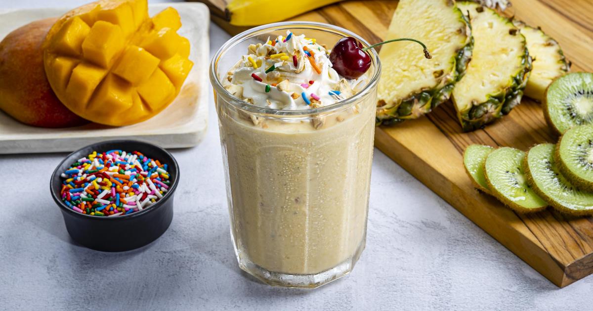 - Purée kiwi, banana, mango, pineapple, milk and ice cream in a blender on high until smooth; serve garnished with whipped topping, cherries, sprinkles and cashew mixture. Makes about 4½ cups.