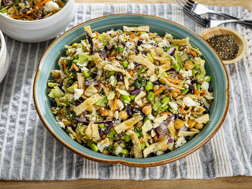 Wheatberries are a whole grain, so they have the fiber your body needs. Edamame, black beans and garbanzo beans lend this salad a rich, creamy taste and plenty of protein. The crunchy lettuces and vegetables along with the crispy wontons of the DOLE® Chopped Sesame Asian Kit round out this delightfully filling salad.